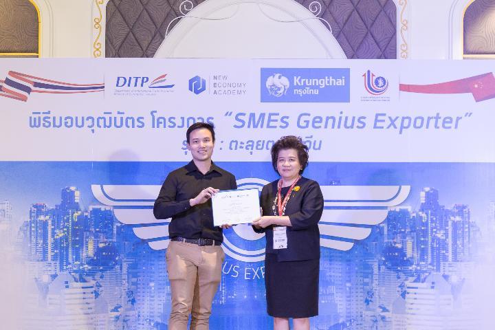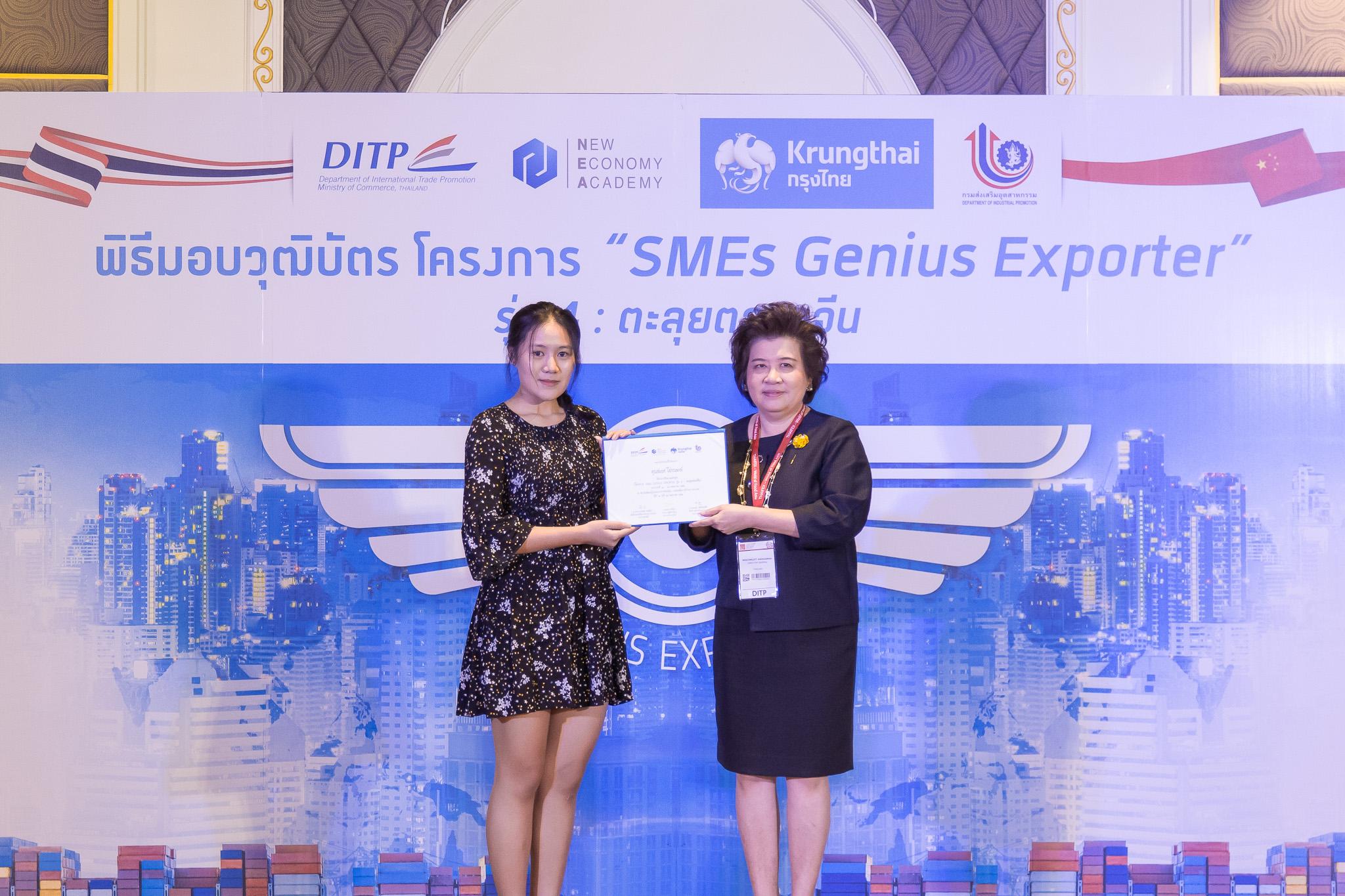 ซึ่งมีพิธีมอบวุฒิบัตรโครงการ SMEs Genius Exporter และกล่าวแสดงความยินดี โดยมีคุณบรรจงจิตต์ อังศุสิงห์ อธิบดีกรมส่งเสริมการค้าระหว่างประเทศ กระทรวงพาณิชย์ ได้มอบวุมิบัตรให้กับผู้ผ่านการอบรม ณ อิมแพคอารีน่า เมืองทองธานี เมื่อวันที่ 28 พฤษภาคม 2562 ที่ผ่านมา